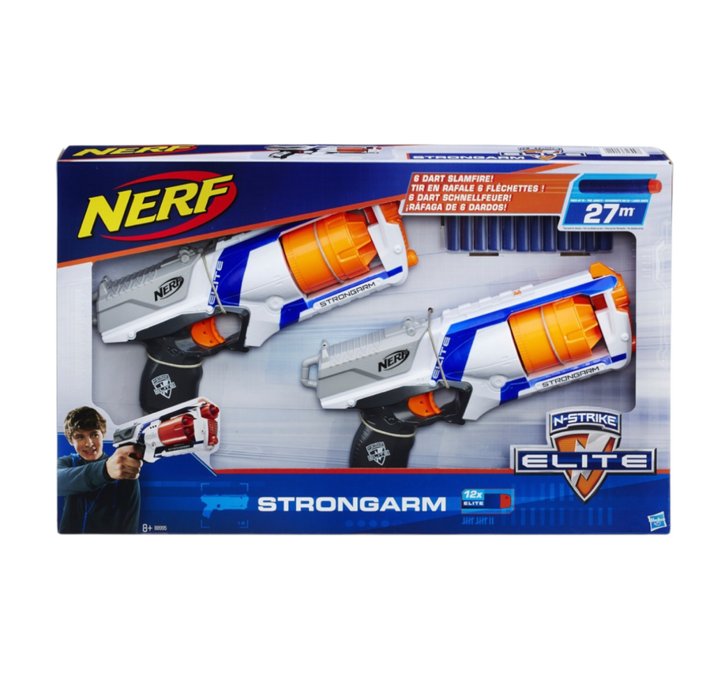 - Fire 6 darts in a row from each quick-draw, fast-firing Nerf Elite Strongarm blaster