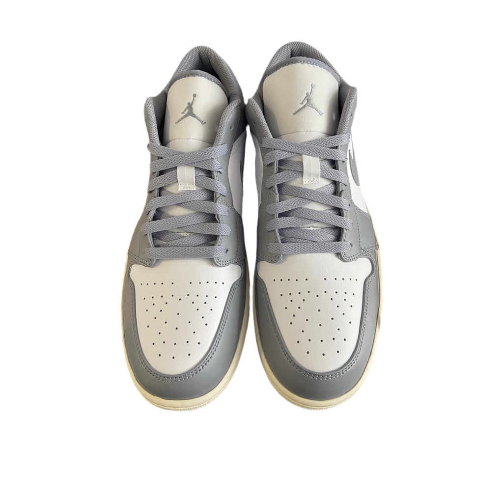 The Air Jordan 1 Low In “Vintage Grey” The pair shows a simple White leather on the base with Grey covering the overlays, laces, Swoosh logos, Jumpman logo sitting on the tongue, and rubber outsole. It includes a White embroidered Wings logo on the heel and an aged midsole to complete the look.
