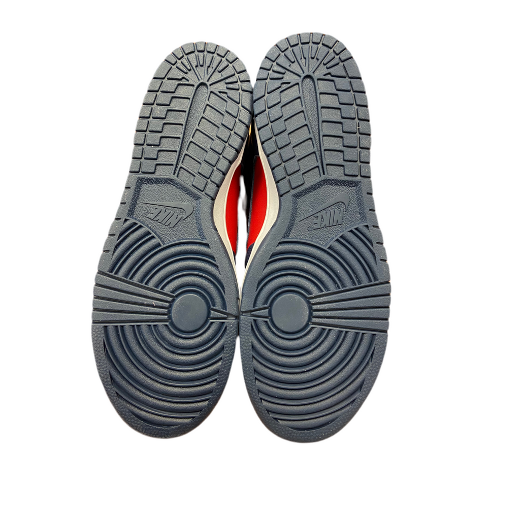 The Supreme x Nike Dunk High SB ‘By Any Means’ arrives in a varsity-inspired ‘Red Navy’ colorway, the brands’ first Dunk High collaboration since 2003. The leather upper features a bold crimson base with contrasting navy overlays, along with prominent branding elements first seen on a New Era fitted cap from Supreme’s 2008 collection. They include a ‘No Love’ graphic on the lateral forefoot and ‘By Any Means’ embroidered in wraparound lettering on the back heel, complete with an integrated ‘NY’ logo with a red Swoosh. A Swoosh is similarly overlaid on the ‘SUP’ woven tongue tag, while ‘Supreme Team’ script adorns the back of the collar. Inside the shoe, a red sockliner displays dual Supreme and Nike SB branding.